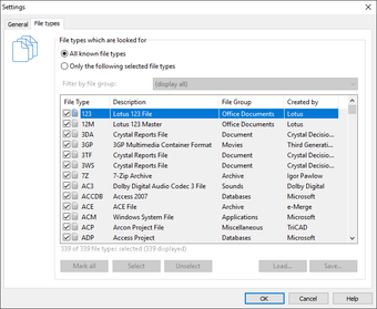 Over 400 file types and version can be recognized and restored, including Word docu-ments, Excel workbooks, Access databases, and virtually every sort of commonly used graphics, photo, movie, and music formats (SVG, MP4, BLEND, AUP, JPEG, AVI, MPEG, MP3, WAV, BMP, TIFF, Corel Draw, Photoshop, Framemaker, Adobe Illustrator, and many more).